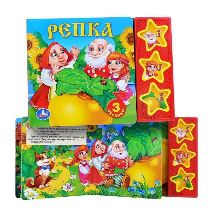 Книга воспроизводит 3 песенки: "Во огород дед выходил..", "Стали вместе по порядку, дед за репку, я за бабку..", "Песенка про репку".