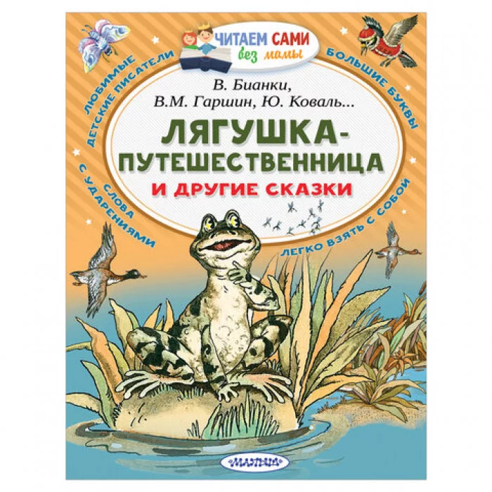 «Лягушка-путешественница и другие сказки» – это отличный сборник сказок про животных для самостоятельного чтения. В этой книге удобного формата большие буквы, слова с ударениями и, конечно, знаменитые произведения В. Бианки, В.М. Гаршина, Ю. Коваля и Н. Сладкова.