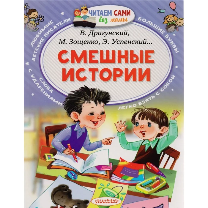 Книга «Смешные истории» прекрасно подходит для первого самостоятельного чтения. Ведь в этом сборнике удобного формата весёлые истории для детей самых известных детских писателей – В. Драгунского, Э. Успенского, В. Голявкина и других. В книге большие буквы, слова с ударениями и цветные иллюстрации. Книжки серии «Читаем сами без мамы» можно взять с собой в дорогу, на прогулку и читать вместе с друзьями!
