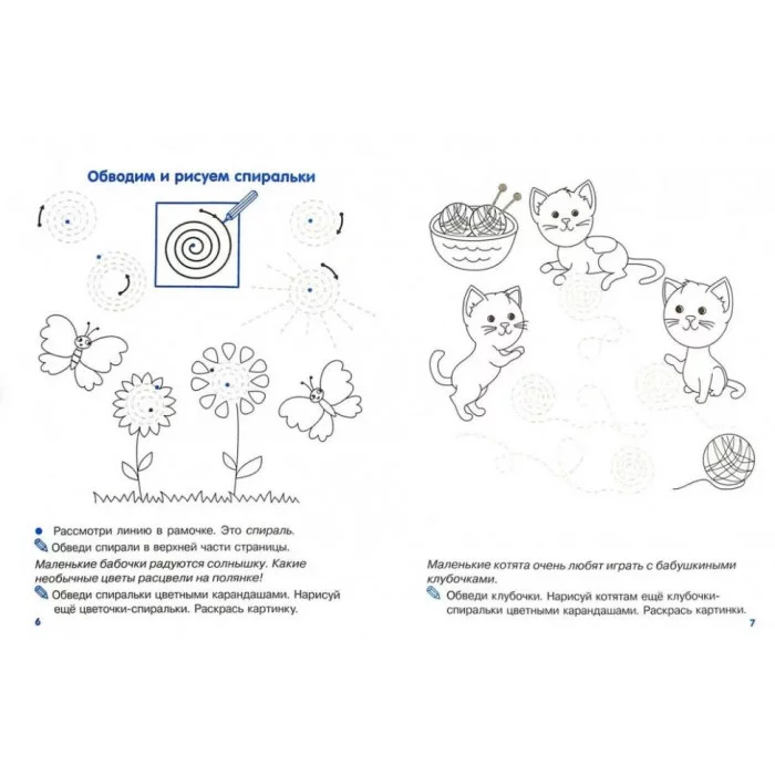 Эти прописи научат рисовать изогнутые и закрученные линии, творчески использовать их в дорисовке картинок.