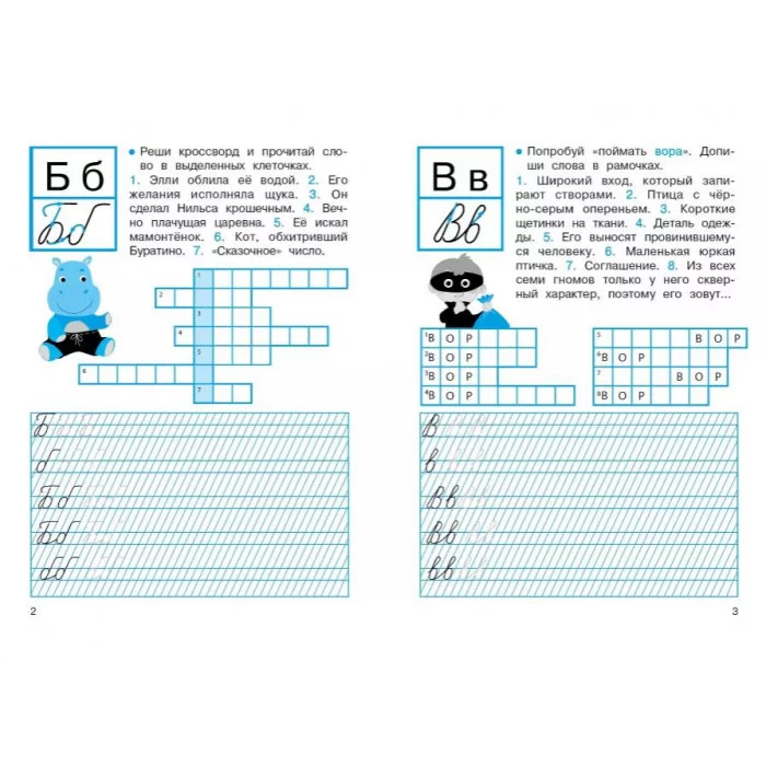 Пособие поможет первоклассникам освоить правильное написание и соединение букв, а различные кроссворды, чайнворды и «лесенки» слов активизируют у ребёнка умственную деятельность, развивают логическое мышление и память, помогают обогатить словарный запас, формируют орфографическую зоркость.