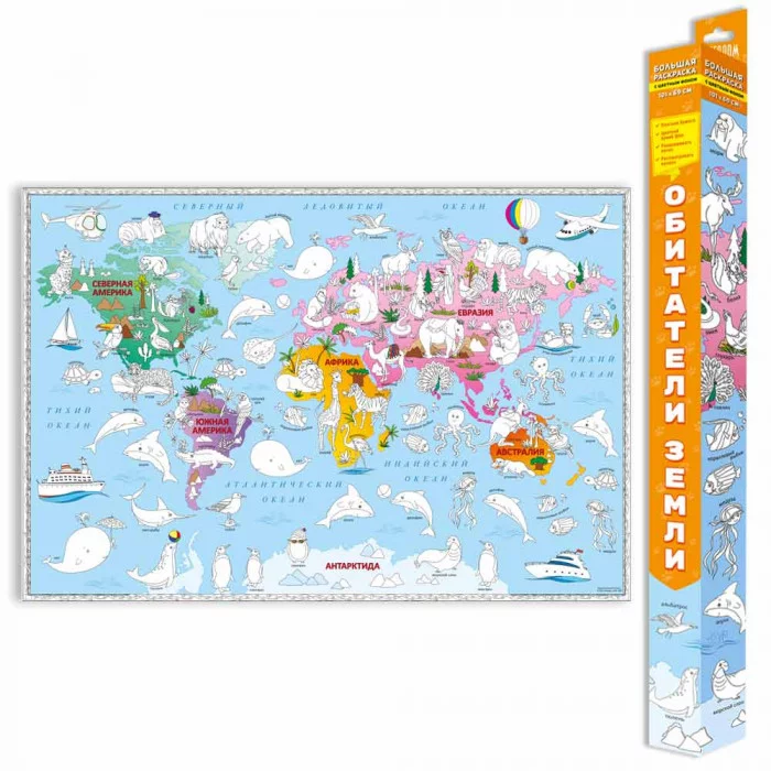 Обитатели животного мира Земли расселились по материкам и океанам нашей планеты на огромной карте. На каждом континенте ребенок сможет раскрасить самых интересных животных – медведей, слонов, кенгуру, моржей и многих других!