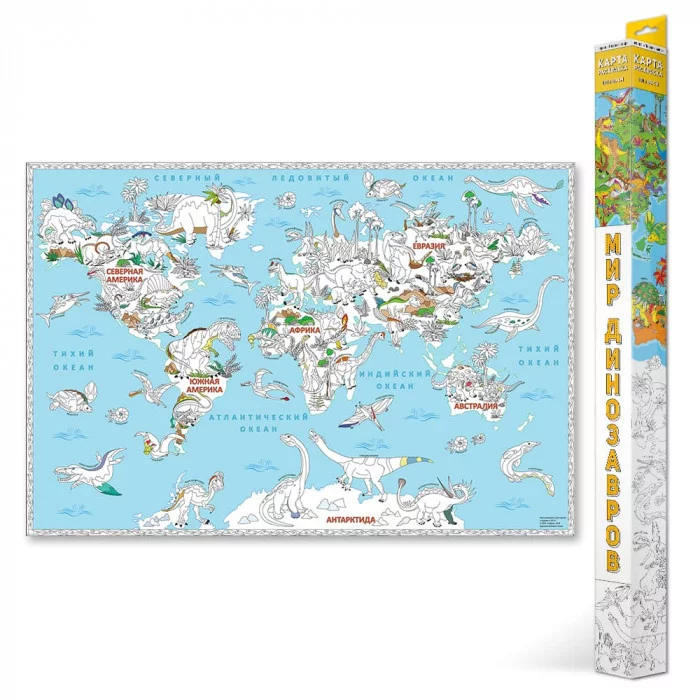 Издательство «ГЕОДОМ» выпустило большую раскраску «В мире динозавров» форматом 101*69 см, чтобы сделать увлечение динозаврами не только развлекательным для Ваших детей, но и познавательным! Виды динозавров на раскраске расположены таким образом, что можно понять, на каком материке в современном мире их можно было бы встретить. Бумага раскраски подходит для фломастеров, карандашей, гуаши, акварельных красок и всего остального – Ваш малыш может дать волю воображению!