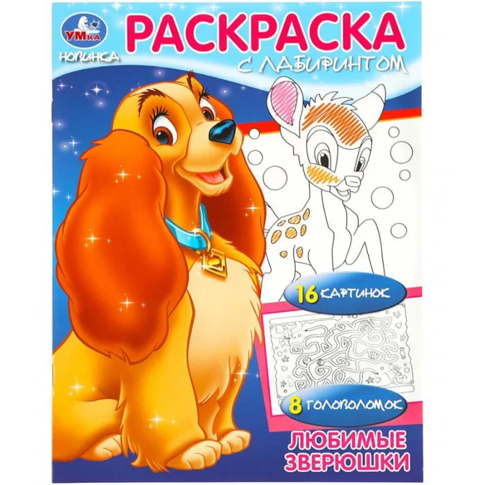 Любимые зверюшки Раскраска Лабиринт 16 картинок 195х255мм Скрепка 16 стр Умка 978-5-506-08487-7
