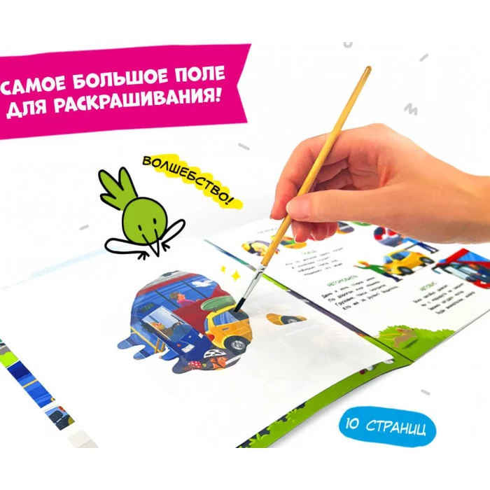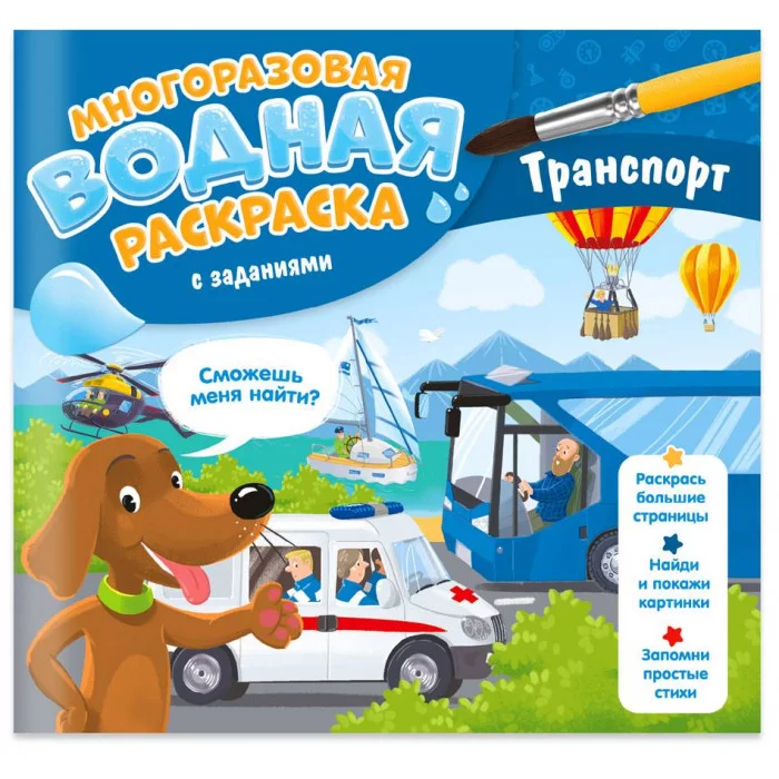 Многоразовая водная раскраска с заданиями поможет малышу почувствовать себя настоящим волшебником! Проведите по листу мокрой кисточкой – и он превратится в яркий рисунок. А когда картинка высохнет, её снова можно будет раскрасить. Книжка-раскраска с заданиями и развивающими стихами познакомит ребёнка с разными видами транспорта – читайте, раскрашивайте и ищите, кто спрятался на страницах книжки! Рекомендованный возраст: 3+.