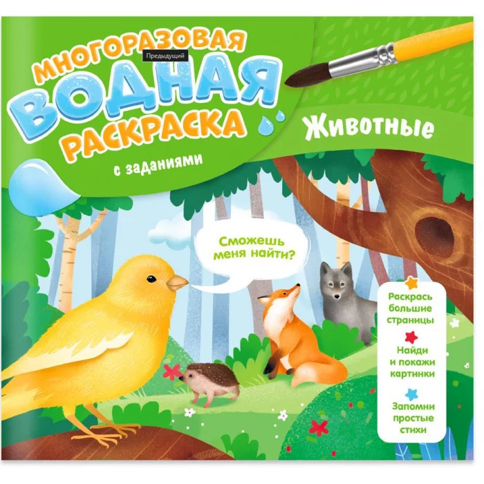 Многоразовая водная раскраска с заданиями поможет малышу почувствовать себя настоящим волшебником! Проведите по листу мокрой кисточкой – и он превратится в яркий рисунок. А когда картинка высохнет, её снова можно будет раскрасить. Книжка-раскраска с заданиями и развивающими стихами познакомит ребёнка с животными Земли – читайте, раскрашивайте и ищите, кто спрятался на страницах книжки! Рекомендованный возраст: 3+.