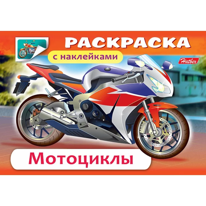 Раскраска книжка 4л А5ф с НАКЛЕЙКАМИ на скобе -Мотоциклы- изд-во: Хатбер-Пресс