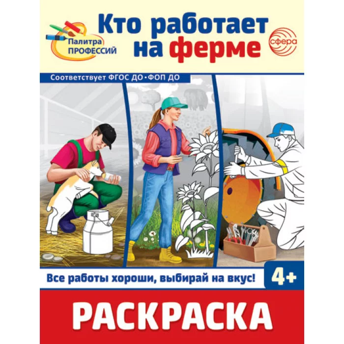 Серия раскрасок «Палитра профессий» познакомит дошкольников с различными профессиями, поможет развить мелкую моторику и подготовить руку к письму. Каждый сюжет раскраски сопровождается стихотворением. Благодаря чётким детальным изображениям, мальчики и девочки легко догадаются, кто показан на картинке. Раскрашивая страницу за страницей, дети узнают, чем занимаются работники фермы: от агронома до пчеловода. Материалы раскраски подготовлены в соответствии с ФГОС ДО. В раскраске «Кто работает на ферме» представлены следующие профессии: агроном, овощевод, доярка, пчеловод. ветеринар. зоотехник. рыбовод, механизатор. Для более полного рассказа о профессиях рекомендуется использовать комплекты карточек серии «Мир профессий» https://www.sfera-book.ru/catalog/naglyadnye_posobiya/demonstratsionnye_materialy/demonstratsionnye_kartinki_materialy/