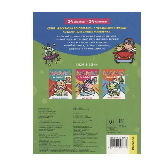 Серия «Раскраска по образцу» с забавными героями создана для самых маленьких. На каждой странице есть цветной образец картинки, который подскажет, в какие цвета раскрасить рисунок! Раскраски способствуют развитию мелкой моторики, образного мышления, усидчивости и внимательности.