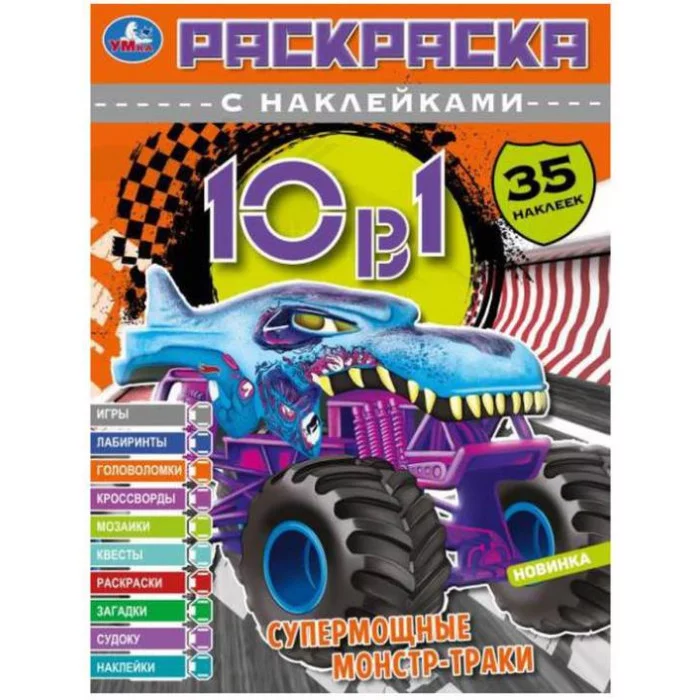 Супермощные монстр-траки Раскраска 10в1 с наклейками 35 наклеек 215х285мм 16стр Умка 978-5-506-07332-1