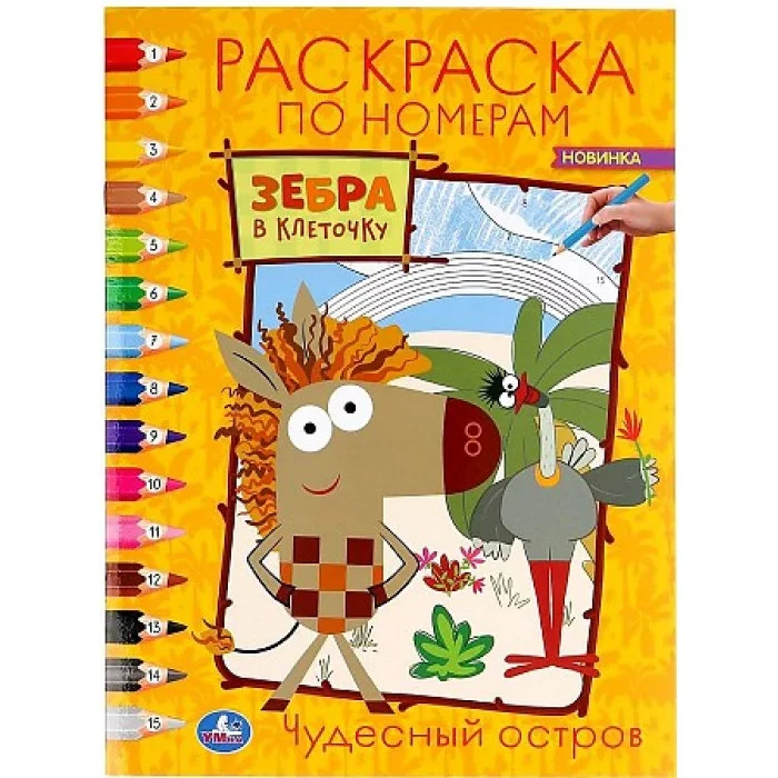 Раскраска по номерам «Зебра в клеточку. Чудесный остров», отличный подарок для ребёнка: картинки для раскрашивания тщательно прорисованы (толстый контур), у каждого цвета свой номер (подсказка на обложке), краткое описание персонажей.