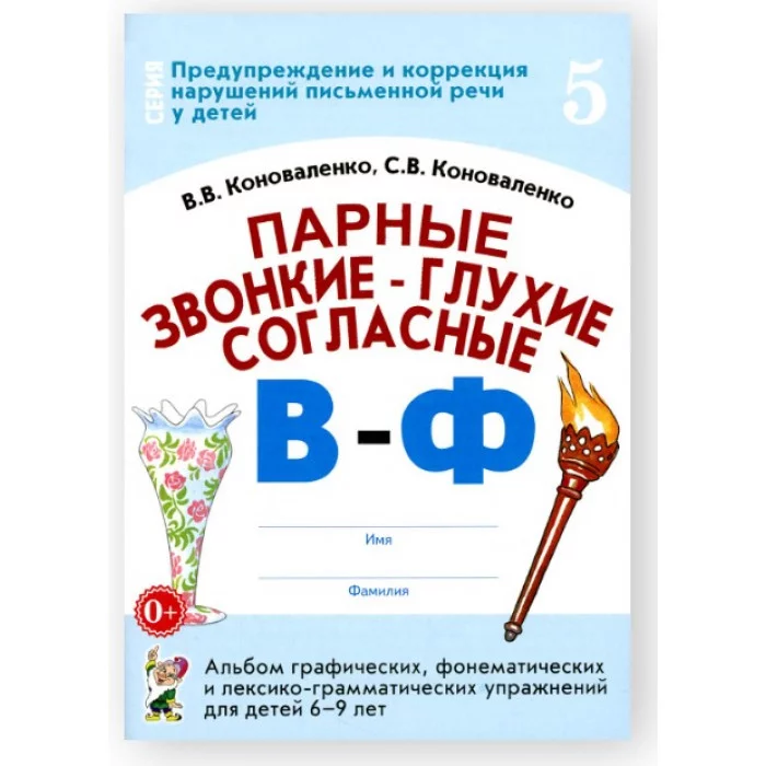 Парные звонкие-глухие согласные В-Ф. Альбом графических, фонематических и лексико-грамматических упражнений для детей 6-9 лет авт:Коноваленко В.В., Коноваленко С.В. 978-5-00160-623-9