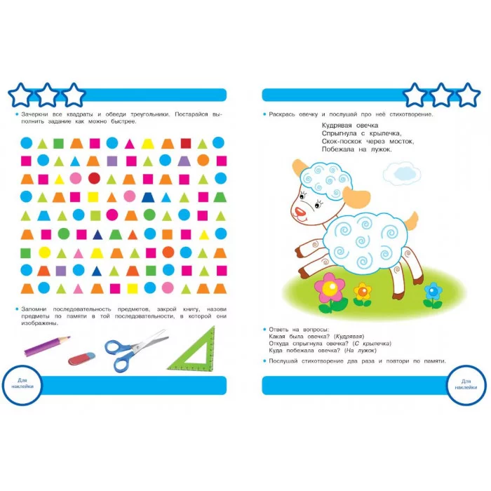 Не секрет, что все дети любят, когда их хвалят. А ещё больше они любят получать подарки. .В этой рабочей тетради за правильное и аккуратное выполнение заданий маленьких учеников ждут призы — поощрительные наклейки. Для них отведено место на каждой странице. В конце занятия предложите ребёнку самому выбрать наклейку и разместить её на странице. .Хвалить детей очень важно, ведь тем самым вы поддерживаете у них интерес к учёбе. .Для детей дошкольного возраста .