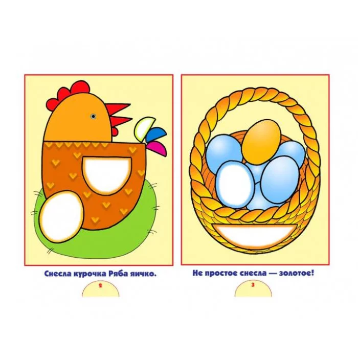 Книжка "Форма. Цвет" из серии "Школы семи гномов", второй год обучения, основана на сказке "Курочка Ряба", имеет крупные и красочные картинки, некоторые детали героев сказки изображены в виде простых геометрических форм.