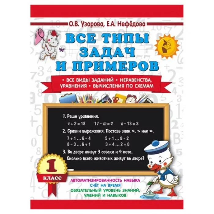 Книга "Все виды задач и примеров 1 класс. Все виды задач. Неравенства, уравнения. Расчеты по схемам" Узоровой Ольги Васильевны и Нефедовой Елены Алексеевны содержит различные типы задач и примеров по математике для учащихся 1 класса. В книгу включены неравенства, уравнения и расчеты по схемам. В нем также есть примеры с «окнами», в которые учащимся нужно вставлять цифры или знаки.
