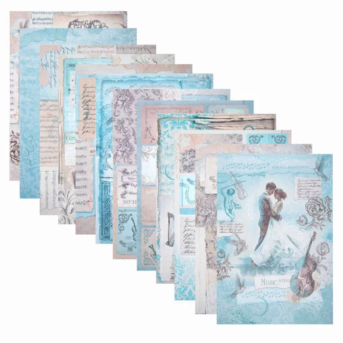 В набор входят 12 листов двусторонней бумаги плотностью 240 г/м2, содержащих 12 вариантов дизайна: 10 фоновых дизайнов и 2 набора с фигурными вырубками для вырезания. Стандартный размер бумаги (15х21 см) делает её удобной для использования в создании скрап-альбомов. Матовая бумага отличается высоким качеством печати.