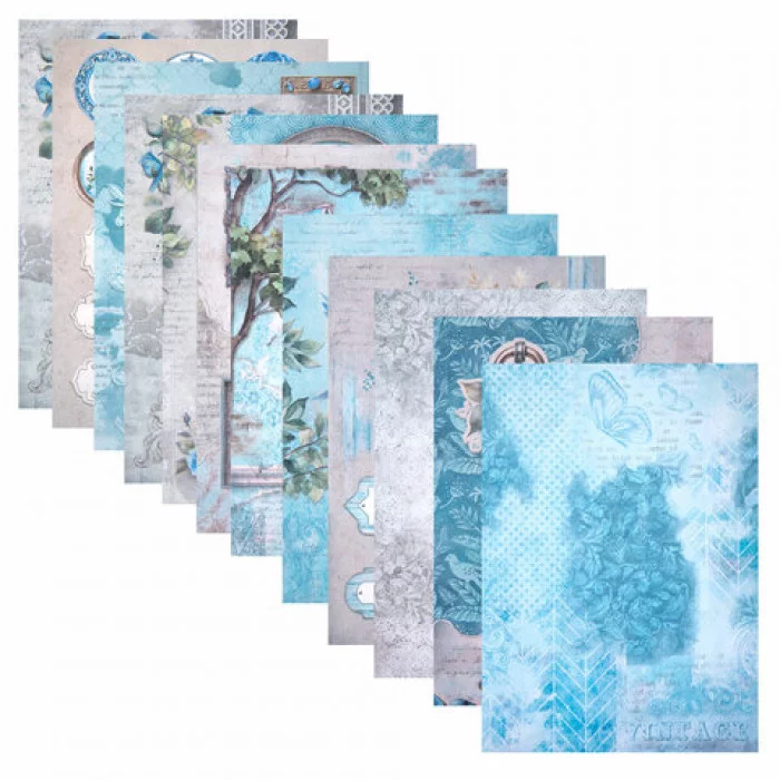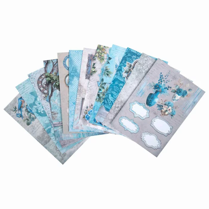 В набор входят 12 листов двусторонней бумаги плотностью 240 г/м2, содержащих 12 вариантов дизайна: 10 фоновых дизайнов и 2 набора с фигурными вырубками для вырезания. Стандартный размер бумаги (15х21 см) делает её удобной для использования в создании скрап-альбомов. Матовая бумага отличается высоким качеством печати.