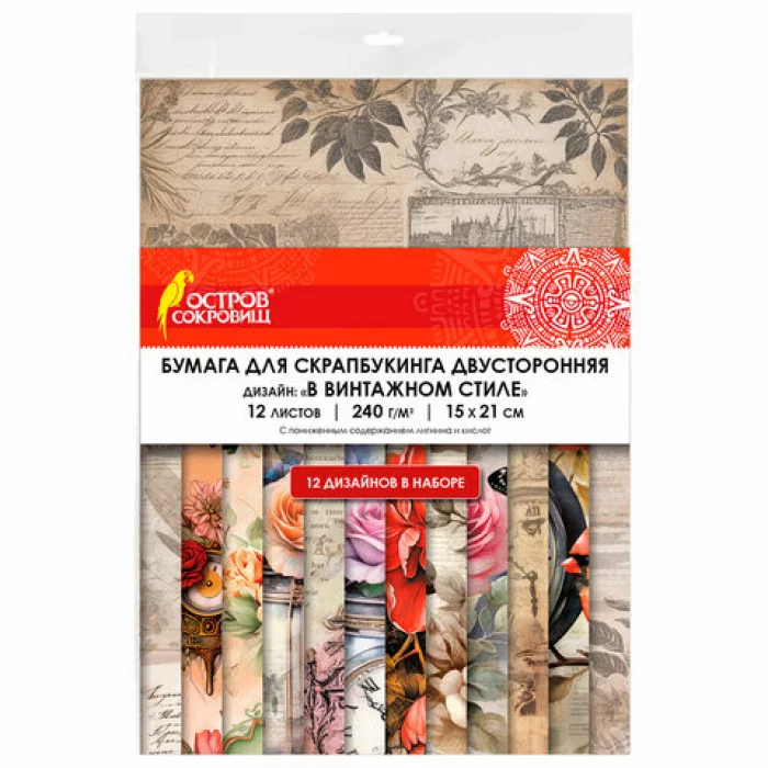Бумага для скрапбукинга 15х21 см "В винтажном стиле", двусторонняя, 12 листов, 240 г/м2, ОСТРОВ СОКОРВИЩ, 665444