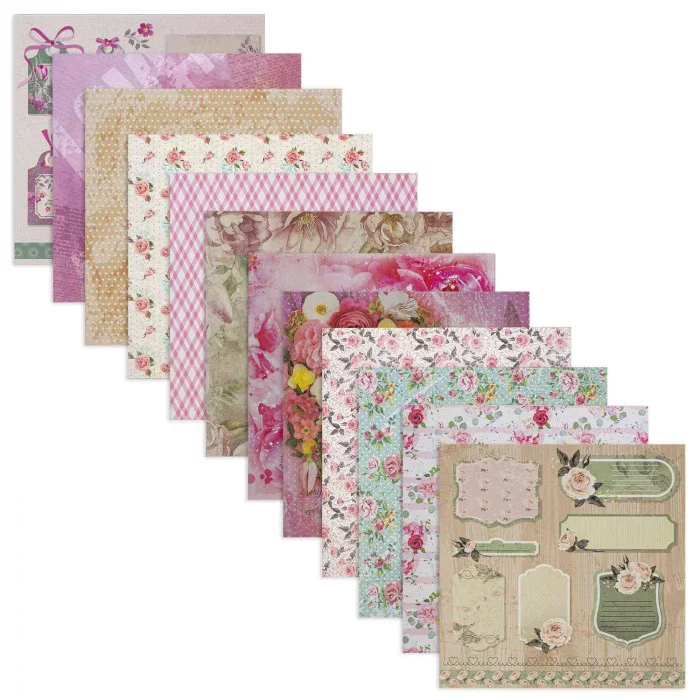 В набор входят 12 листов двусторонней бумаги плотностью 180 г/м2, содержащих 12 вариантов дизайна: 10 фоновых дизайнов и 2 набора с фигурными вырубками для вырезания. Стандартный размер бумаги 30х30 см делает ее удобной для использования в создании скрап-альбомов. Матовая бумага отличается высоким качеством печати.
