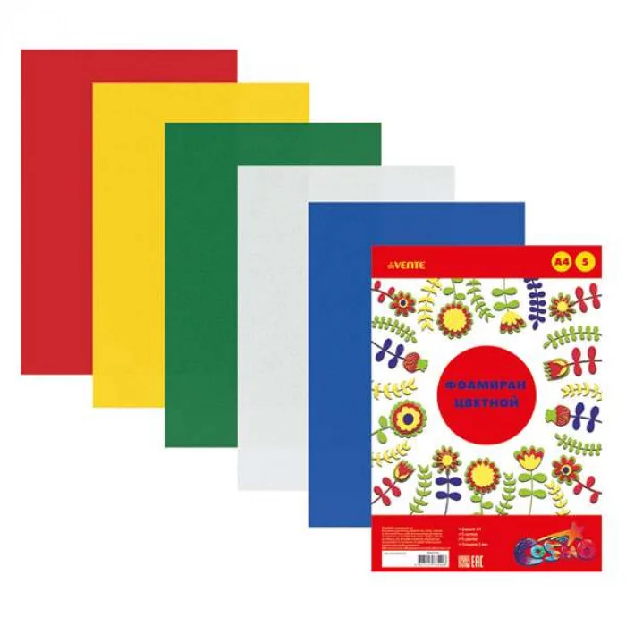 Фоамиран цветной A4 "deVENTE" 5 цв, 5 л, толщина 2 мм, пластиковый пакет с европодвесом.