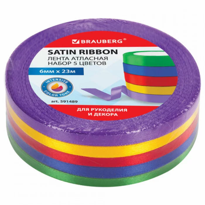 Лента атласная ширина 6 мм, ИНТЕНСИВ ассорти, цена за 1 ленту, без выбора цвета, по 23 м, BRAUBERG, Разбор591489