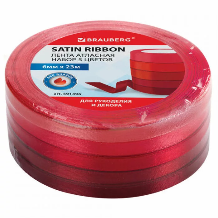 Атласная лента является универсальным текстильным изделием, что обусловлено широкой сферой ее использования. Набор лент атласных BRAUBERG предназначен для оформления подарков, рукоделия, декора, а также используется во флористике для оформления букетов. Изделие представляет собой набор из атласных лент, изготовленных из 100% полиэстера, с ткаными кромками на обоих краях. Кромка на краях лент выполнена с применением полиэстеровой нити. Ленты изготовлены с применением саржевого способа переплетения нитей. В набор входит 5 лент красных и бордовых оттенков от светло-красного до насыщенного бордового цвета шириной 6 мм (± 3%) и длиной 23 м. Каждая лента намотана на втулку из пенополистирола. Набор лент упакован в термоусадочную пленку, содержащую этикетку с краткой информацией о товаре. Ширина ленты: 6 мм. Длина: 23 м. Количество в комплекте: 5 шт.. Количество цветов: 5. Цвет: красный. Материал: полиэстер. Особенности: спектр цветаБренд - BRAUBERG.Производитель - Китай.Артикул - 591496.Штрихкод - 460622429