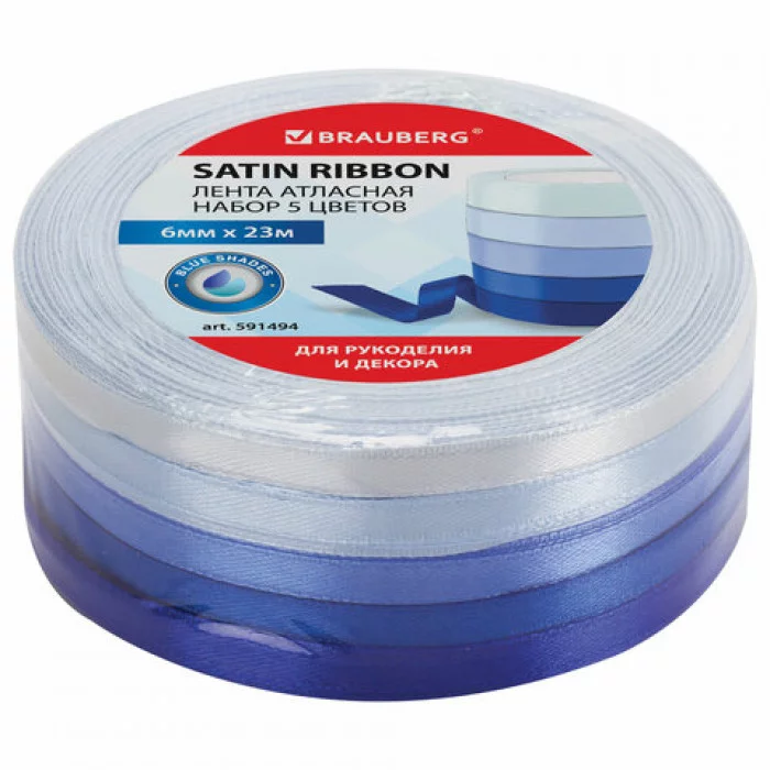 Атласная лента является универсальным текстильным изделием, что обусловлено широкой сферой ее использования. Набор лент атласных BRAUBERG предназначен для оформления подарков, рукоделия, декора, а также используется во флористике для оформления букетов. Изделие представляет собой набор из атласных лент, изготовленных из 100% полиэстера, с ткаными кромками на обоих краях. Кромка на краях лент выполнена с применением полиэстеровой нити. Ленты изготовлены с применением саржевого способа переплетения нитей. В набор входит 5 лент голубых и синих оттенков от светло-голубого до насыщенного синего цвета шириной 6 мм (± 3%) и длиной 23 м. Каждая лента намотана на втулку из пенополистирола. Набор лент упакован в термоусадочную пленку, содержащую этикетку с краткой информацией о товаре. Ширина ленты: 6 мм. Длина: 23 м. Количество в комплекте: 5 шт.. Количество цветов: 5. Цвет: синий. Материал: полиэстер. Особенности: спектр цветаБренд - BRAUBERG.Производитель - Китай.Артикул - 591494.Штрихкод - 4606224292854