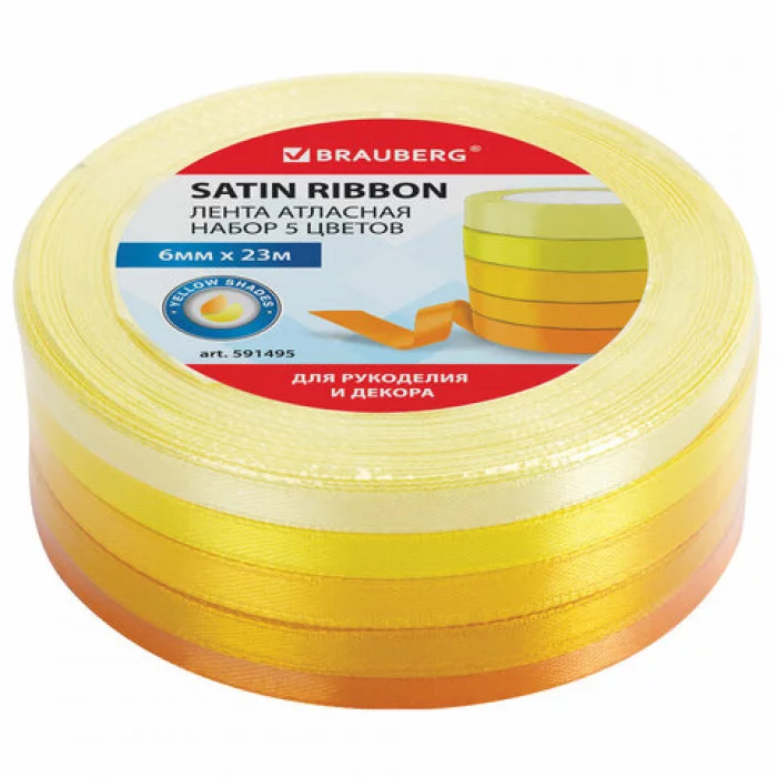 Атласная лента является универсальным текстильным изделием, что обусловлено широкой сферой ее использования. Набор лент атласных BRAUBERG предназначен для оформления подарков, рукоделия, декора, а также используется во флористике для оформления букетов. Изделие представляет собой набор из атласных лент, изготовленных из 100% полиэстера, с ткаными кромками на обоих краях. Кромка на краях лент выполнена с применением полиэстеровой нити. Ленты изготовлены с применением саржевого способа переплетения нитей. В набор входит 5 лент желтых и оранжевых оттенков от светло-желтого до насыщенного оранжевого цвета шириной 6 мм (± 3%) и длиной 23 м. Каждая лента намотана на втулку из пенополистирола. Набор лент упакован в термоусадочную пленку, содержащую этикетку с краткой информацией о товаре. Ширина ленты: 6 мм. Длина: 23 м. Количество в комплекте: 5 шт.. Количество цветов: 5. Цвет: желтый. Материал: полиэстер. Особенности: спектр цветаБренд - BRAUBERG.Производитель - Китай.Артикул - 591495.Штрихкод - 4606224292