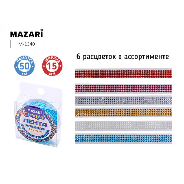 Лента клейкая декоративная со стразами, размер 50 см х 1.5 см, микс цветов, ПВХ-упаковка M-1340