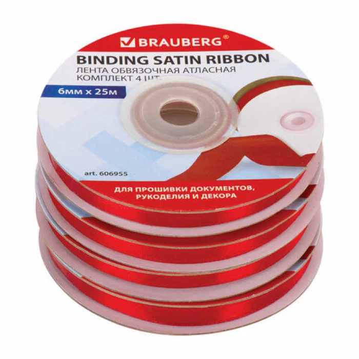 Обвязочная атласная лента BRAUBERG с ткаными кромками на обоих краях предназначена для декорирования подарков, прошивки документов, использования во флористике, рукоделии и декоре. Изделие представляет собой набор из 4 атласных лент красного цвета, изготовленных из 100% полиэстера с ткаными кромками на обоих краях. Кромка на краях лент выполнена с применением полиэстеровой нити. Изготовлены с применением саржевого способа переплетения нитей. Каждая из 4-х лент шириной 6 мм (± 3%), плотностью 0,77 г/м2 и длиной 25 м намотана на картонный рулон с пластиковой втулкой. Комплект упакован в прозрачный полипропиленовый пакет с застежкой, содержащий этикетку с краткой информацией о товаре. Ширина ленты: 6 мм. Длина: 25 м. Количество в комплекте: 4 шт.. Количество цветов: 1. Цвет: красный. Материал: полиэстер Бренд - BRAUBERG. Производитель - Китай. Артикул - 606955. Штрихкод - 4606224292786