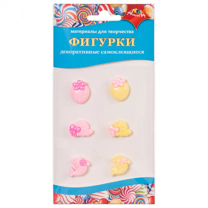 Блестящие самоклеящиеся фигурки. В наборе 6 пластмассовых фигурок с блестящей поверхностью. Фигурки имеют клеевой слой. В ассортименте представлены следующие комбинации: Сердце - вишенка - яблочко; Клубничка - шляпка - дельфин; Киви - банан - ананас; зай