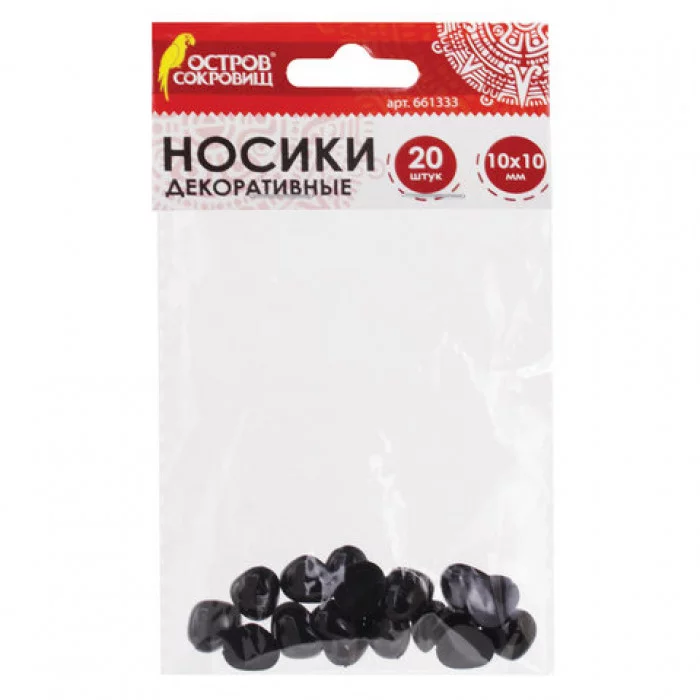 Набор декоративных носиков ОСТРОВ СОКРОВИЩ придаст уникальность и неповторимость игрушкам и прочим поделкам, сделанным своими руками. Декоративные носики позволят сделать игрушку живой и запоминающейся. Подходят для крепления на любых материалах, имеют поверхность без клеевой основы. Изготовлены из высококачественного пластика. Предназначены для детей от 3 лет. Размер - 10х10 мм. Поставляются в пакете с европодвесом. В наборе 20 носиков черного цвета.