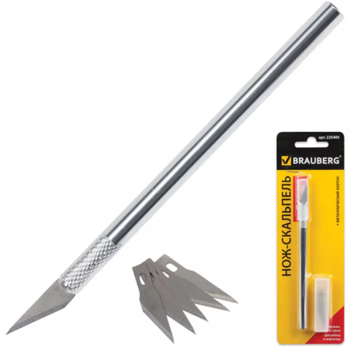 Нож макетный (скальпель) BRAUBERG, металлический корпус, + 5 запасных лезвий, блистер, 235405
