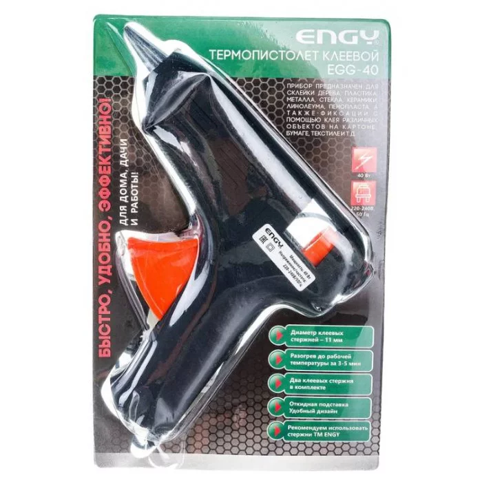 Клеевой пистолет Engy EGG-40 с подставкой, 40 Вт 357116 предназначен для склейки дерева, пластика, металла, стекла, керамики, линолеума, пенопласта, а так же фиксации с помощью клея различных объектов на картоне, бумаге и текстиле и т.д. Может использоваться при работах по герметизации.