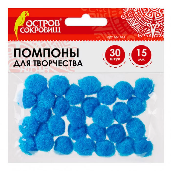 Помпоны для творчества, голубые, 15 мм, 30 шт., ОСТРОВ СОКРОВИЩ, 661441