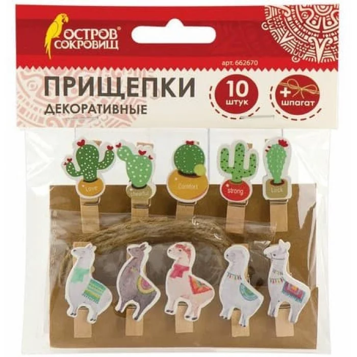Прищепки декоративные "Ламы и кактусы", 10 штук, 3,5 см, ассорти, со шпагатом, ОСТРОВ СОКРОВИЩ, 662670