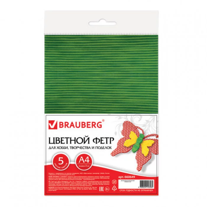 Цветной фетр для творчества А4 210*297мм BRAUBERG с рис., 5л.5цв., толщ.2мм, Цветная графика, 660649 660649