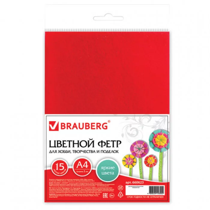 Цветной фетр для творчества, А4, BRAUBERG/ОСТРОВ СОКРОВИЩ, 15 листов, 15 цветов, толщина 2 мм, 660623