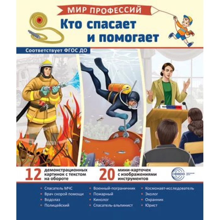 Комплект «Кто спасает и помогает» серии «Мир профессий» содержит 12 демонстрационных картинок. На них изображены работники больниц, которые лечат людей и спасают жизни. На обороте картинок есть интересный и доступный рассказ. Из него дети узнают, чем занимается тот или иной специалист, какие инструменты и приспособления требуются ему для работы и почему эта профессия нужна и важна. В комплекте есть примеры игр и заданий – они станут отличной тренировкой памяти и внимания – и вопросы на закрепление материала, а также карточки с изображениями инструментов и заданиями на обороте. Комплект подходит как для индивидуальной, так и для групповой работы. Список картинок: - Спасатель МЧС - Врач скорой помощи - Водолаз - Полицейский - Военный-пограничник - Пожарный - Кинолог - Спасатель-альпинист - Космонавт-исследователь - Эколог - Охранник - Юрист