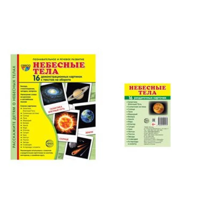 Комплект состоит из: Дем. картинки СУПЕР Небесные тела. 16 демонстр. картинок с текстом на обороте (173х220 мм) Дем. картинки СУПЕР Небесные тела. 16 раздаточных карточек с текстом на обороте (63х87 мм) Комплект состоит из демонстрационных картинок размером 173 х 220 мм и раздаточных карточек размером 63 х 87 мм, предназначен для работы с дошкольниками и младшими школьниками на индивидуальных и групповых занятиях. На лицевой стороне каждой картинки дается цветное изображение с указанием темы, на обратной - краткое описание, стихотворение, загадка и вопросы по теме. Название каждой темы имеет перевод на английский язык и соответствующую транскрипцию. Материал излагается доступным для ребенка языком и целиком раскрывает тему. При использовании демонстрационных картинок в комплекте с раздаточными карточками, взрослый (педагог) сможет проводить занятие с демонстрационным материалом, а детям на стол положить раздаточные карточки. Подобная работа будет эффективна, поскольку предполагает обратную связь с ребенко...