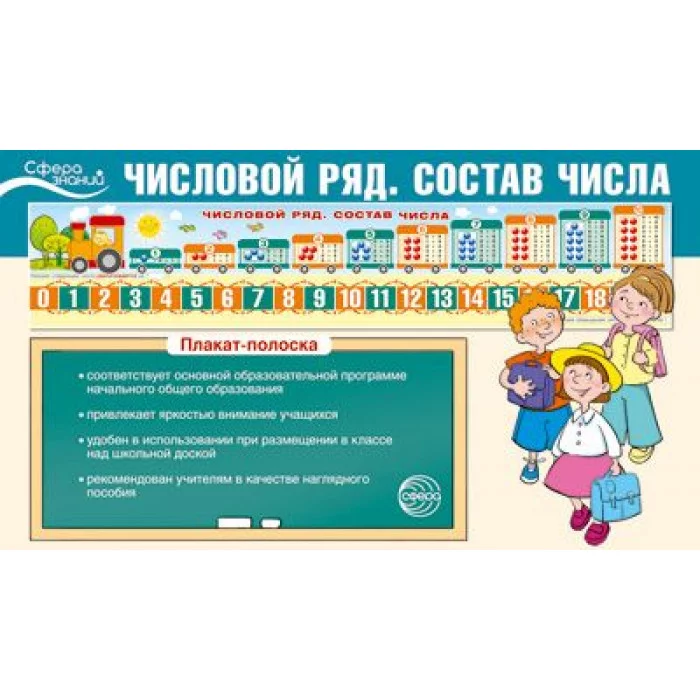 Плакат-полоска «Числовой ряд. Состав числа» поможет наглядно представить числовой ряд и состав числа, даст возможность обучающимся производить операции с натуральными числами, разовьёт математические способности, логику и мышление, украсит с пользой кабинет начальных классов. К плакату прилагается набор карточек с числами и математическими знаками, с помощью которых можно составить примеры и представить таким образом число в виде суммы или разности чисел. Плакат-полоска соответствует основной образовательной программе начального общего образования, удобен в использовании при размещении в классе над школьной доской, рекомендован учителям в качестве наглядного пособия.