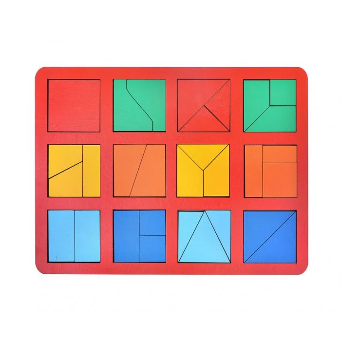 Задача малыша – собрать 12 квадратов из цветных элементов: треугольников, прямоугольников и других фигур.