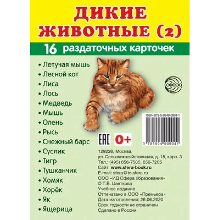 16 раздаточных карточек размером 63х87 мм для познавательного и речевого развития. На обороте каждой карточки - название животного на русском и английском языках. список картинок: Летучая мышь Лесной кот Лиса Лось Медведь Мышь Олень Рысь Снежный барс Суслик Тигр Тушканчик Хомяк Хорёк Як Ящерица