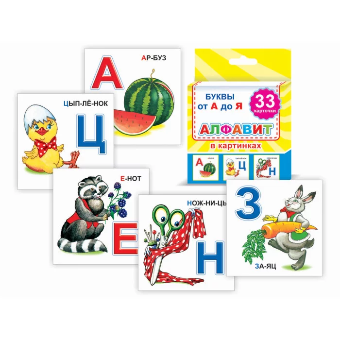 Комплект из 33 обучающих карточек для дошкольников "Алфавит в картинках". Настоящее издание представляет собой картонные карточки 120*120 мм, с печатными буквами русского алфавита и яркими красочными иллюстрациями к ним. Слова-подписи к картинкам разбиты на слоги для обучения ребёнка чтению. Первые уроки знакомства с буквами, обогащают словарный запас, развивают речь, память, воображение. Занимательные карточки превратят процесс обучения в увлекательную игру. Упакованы в картонную коробку.
