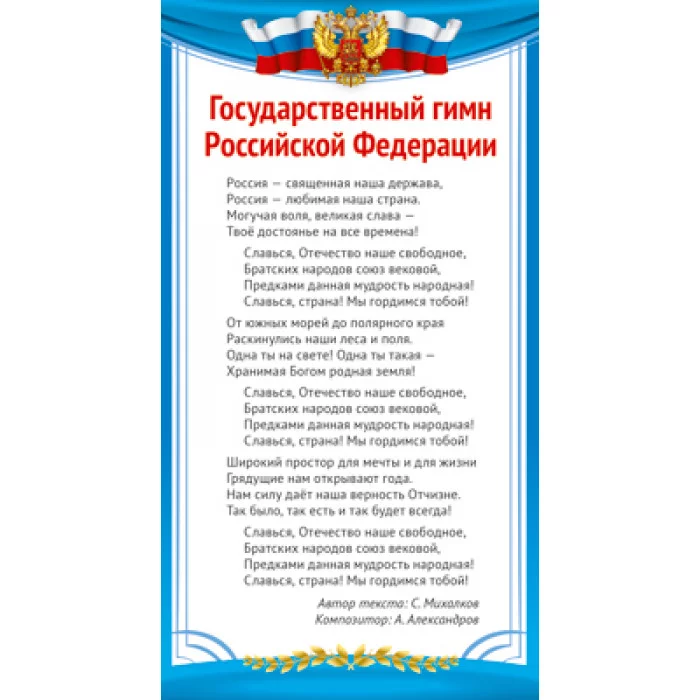 Карточка содержит официальный текст Государственного гимна Российской Федерации. Будет полезна как наглядный материал для занятий по патриотическому воспитанию школьников. На обороте приведен список государственных праздников. Карточка поможет детям выучить слова гимна, вырасти настоящими гражданами своей страны. Может быть использована в качестве закладки.