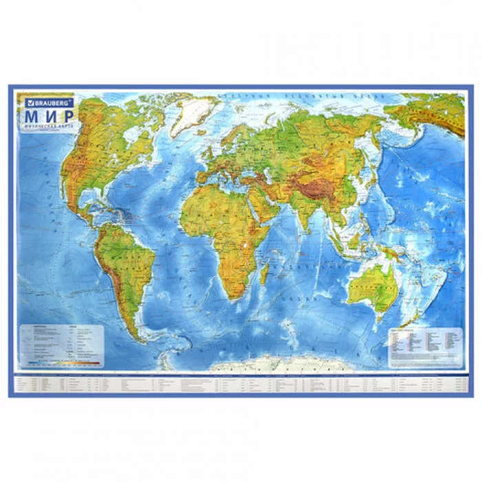 На географической карте мира BRAUBERG отображаются названия континентов, океанов и морей, рек, гор, течений и т. д. Окунитесь в волшебный мир вместе с интерактивной картой мира BRAUBERG благодаря приложению IQ Globen!Отправьтесь в путешествие по самым удивительным местам мира, узнайте о его политическом устройстве, о населяющих мир животных и растениях. Рассмотрите главные мировые достопримечательности или запустите ракету в космос!Скачайте приложение IQ Globen на IOS или Android, в главном меню выберите "Карты", откройте карту мира и наведите камеру на один из материков. Эффект дополненной реальности не заставит себя ждать. Герои приложения помогут в изучении мира.Настенная физическая карта мира с масштабом 1:25 000 000 обладает размером 120х78 см. Выполнена из ламинированной бумаги плотностью 170 г/м2. Поставляется в упаковке с европодвесом. Вид карты: Мир / физическая. Размещение: настенное. Высота: 78 см. Ширина: 120 см. Масштаб: 1 : 25 000 000. Материал: мелованная бумага. Серия: World map. Плотность: 17
