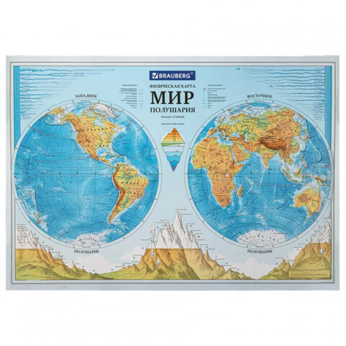 На физической карте мира "Полушария" BRAUBERG можно рассмотреть материки, моря и океаны, высочайшие вершины мира. Окунитесь в волшебный мир вместе с интерактивной картой мира BRAUBERG благодаря приложению IQ Globen!Отправьтесь в путешествие по самым удивительным местам мира, узнайте о политическом устройстве стран, о населяющих мир животных и растениях. Рассмотрите главные мировые достопримечательности или запустите ракету в космос! А также многое другое.Приложение можно скачать на IOS и Android. Настенная физическая карта мира с масштабом 1:37 000 000 обладает размером 101х69 см. Выполнена из ламинированной бумаги плотностью 170 г/м2. Поставляется в тубусе. Вид карты: Мир / физическая. Размещение: настенное. Высота: 69 см. Ширина: 101 см. Масштаб: 1 : 37 000 000. Материал: мелованная бумага. Серия: Half-globe. Плотность: 170 г/м2. Покрытие: ламинация. Упаковка: тубус Бренд - BRAUBERG. Производитель - Россия. Артикул - 112376. Штрихкод - 4606224297880