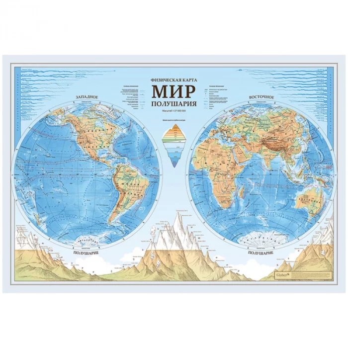 Карта Мира полушария физическая М1:37млн 101*69 ламин GLOBEN КН090 420439