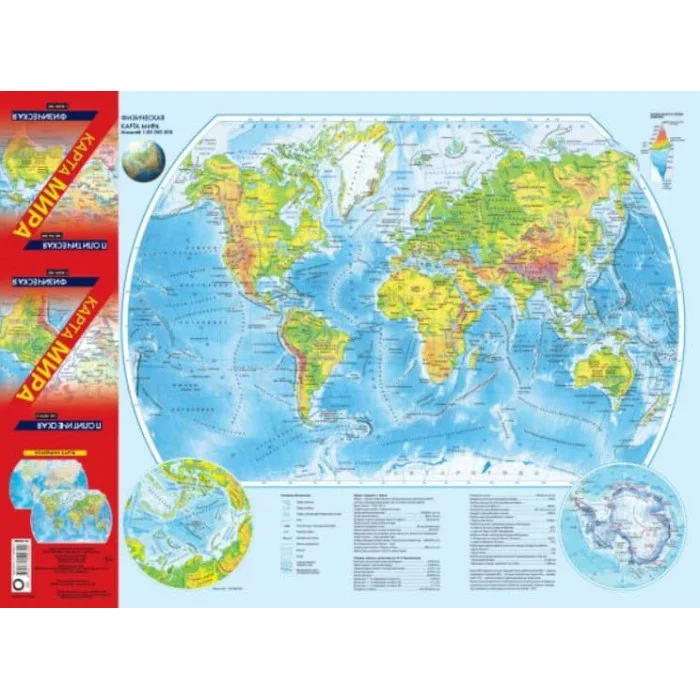 Двухсторонняя складная карта удобного формата. На одной стороне листа дана физическая карта мира масштаба 1:80 000 000, дополненная картами Арктики и Антарктиды, на другой стороне - обновлённая политическая карта мира масштаба 1:65 500 000 с картой-врезкой Европы в масштабе 1:28 000 000. Россия представлена в новых границах: с Донецкой и Луганской народными республиками, Запорожской и Херсонской областями, Республикой Крым и Севастополем.
