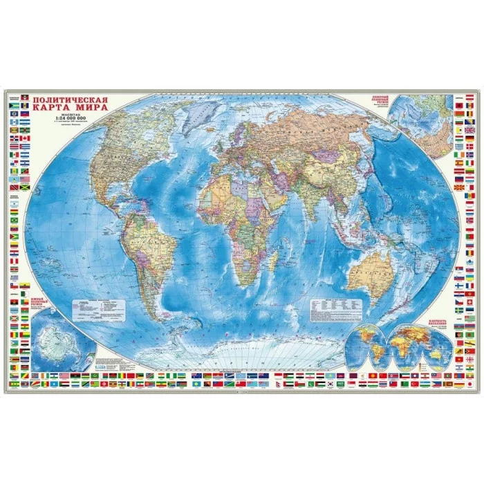 На политической карте мира подробно отражено современное политико-административное устройство мира, даны границы государств. Территории государств выделены цветом. Населённые пункты отображены по числу жителей и административному значению, показаны основные наземные пути сообщения и судоходные каналы. Особенность данной карты в том, что на ней, помимо геополитической информации, размещена символика государств мира. Государственные флаги стран мира сгруппированы по каждому континенту.